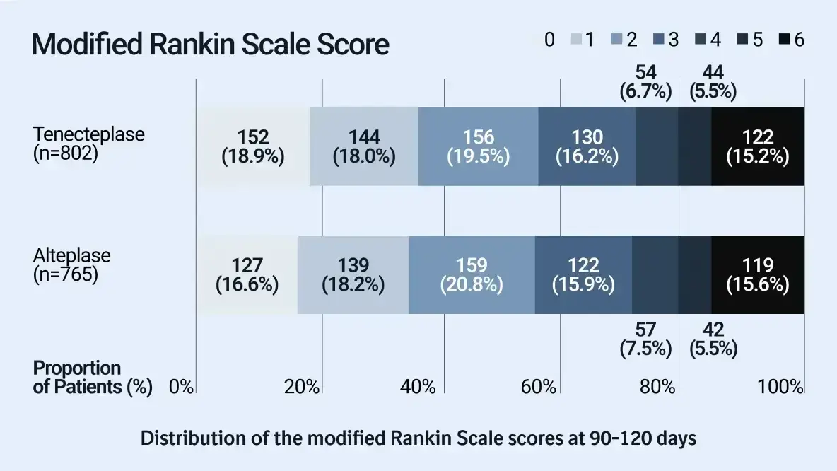 The primary outcome (% patients with mRS score of 0-1 at days 90-120)†2 occurred in 36.9% of tenecteplase patients, versus 34.8% of alteplase patients (unadjusted RD 2.1% [95% CI -2.6 to 6.9]).2