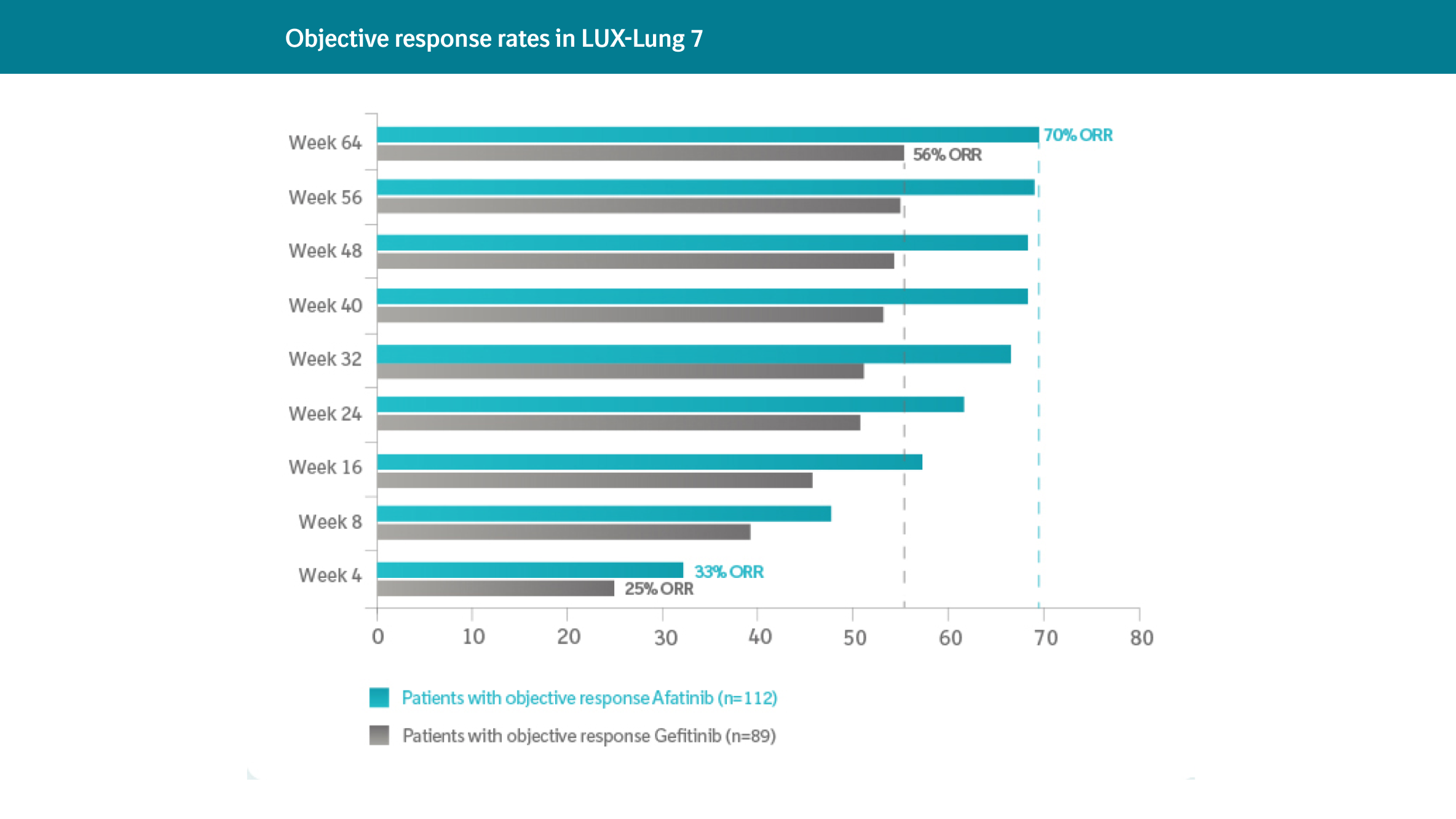 The proportion of patients who achieved an objective response was significantly higher with GIOTRIF® vs gefitinib (70% vs 56%; OR: 1.87 [95% CI: 1.18-2.99]; p=0.0083)
